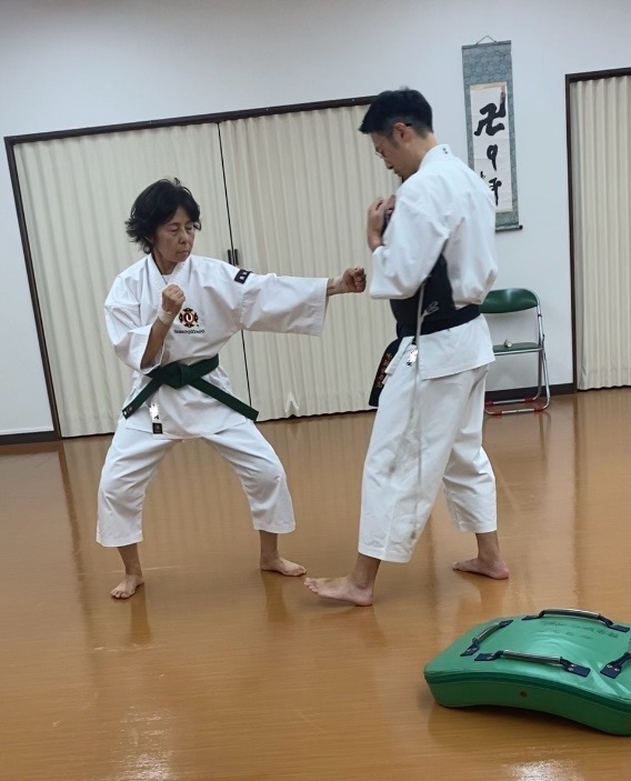 そこで一旦送小手から離れ、足元からの力を上手く上半身に伝えるため、順突きの練習です。突いたときに、身体は回転しますが、引き手を後ろに引いてしまわないことをテーマに練習しました。(引き手を、送小手の掛手に見立てて)