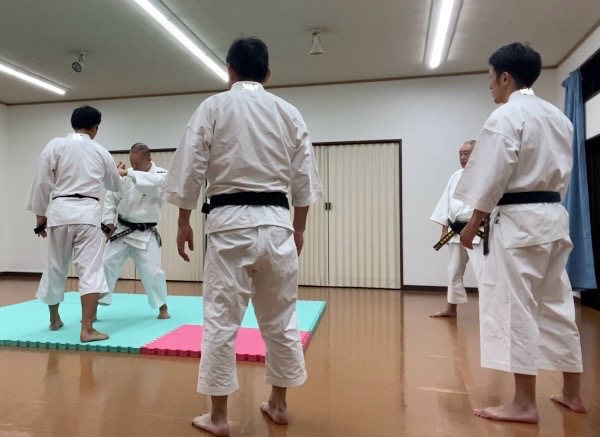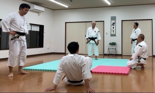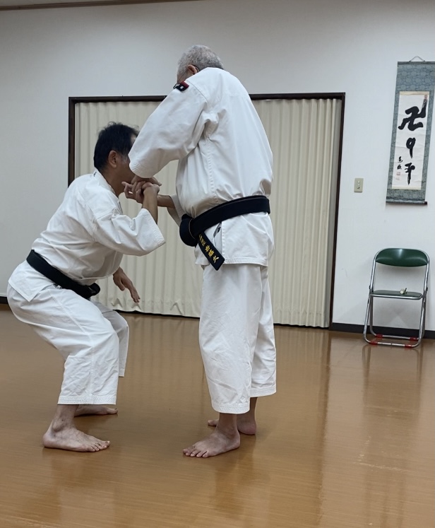 まず始めに、コの字・送小手・逆小手を使ったストレッチで身体をほぐしつつ、掛け手の持ち方なども確認していきます。