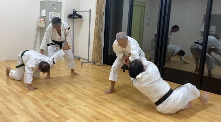 動き疲れたところで、今日は小手抜を「有効利用」した逆小手をやってみます。小手抜の回転力を、崩しに利用することをテーマに研究してみました。