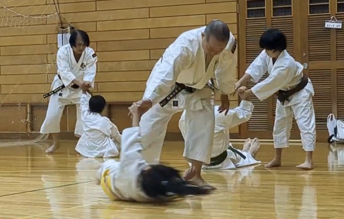 休憩の後は、大人と子供で組んで、逆小手の練習です。上手く重心の位置を操作すると、子供が大人をクルクルと回せます😊