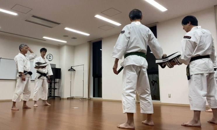続いては今日のメイン、ミット手刀打です。まずは側面方向に振り下ろして、肩周りの動きを刷り込んでいきます。