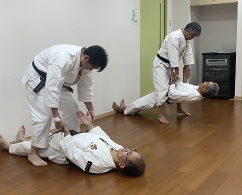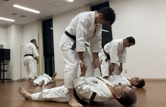 後半は柔法です。今日は寝た状態で「鉤手」の練習です。上の人はデッドリフト、下の人は腕が伸びないように脇を締める練習です。