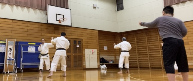 温まったところで基本突き。龍の形、卍の形など難しい単独演武にもチャレンジしてみました。