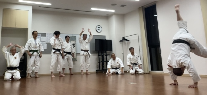 こちらは前受身の様子。受身と倒立で、腕の使い方で似ている部分があり、解説 & 実演。