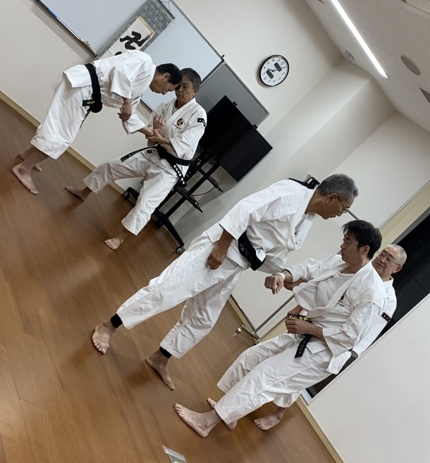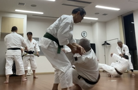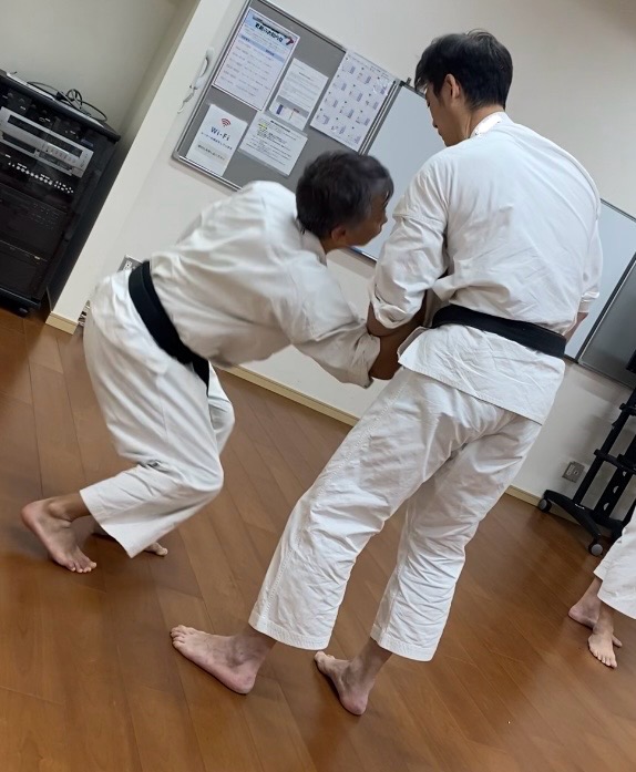 続いては逆系の技を。手首や胸ぐらを掴まれたパターンで、倒し方・倒され方を練習。今日のテーマは「巻き付くように」