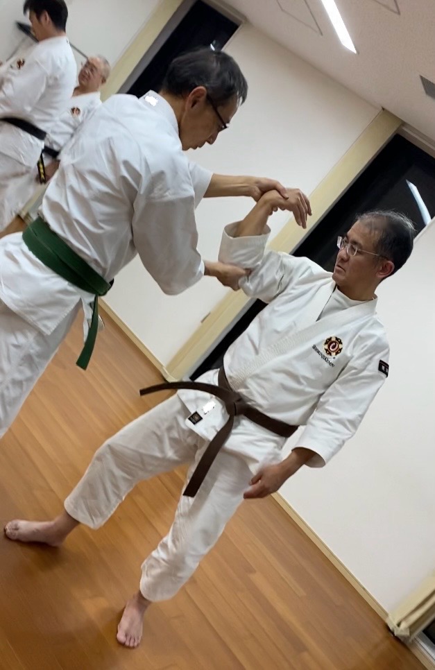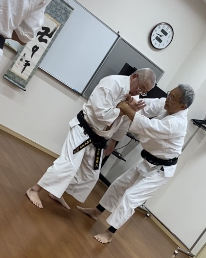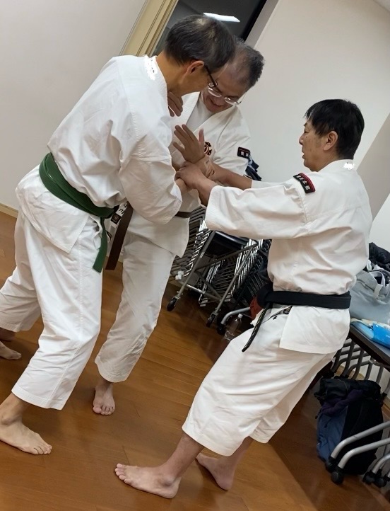 首を締められたときのカウンター「首締守法十字投」。私はこちらで一緒に。今日は、自分の首を締めてしまわないように気をつけて練習しました。(失敗すると、止血帯の要領で一気に締まります💦)