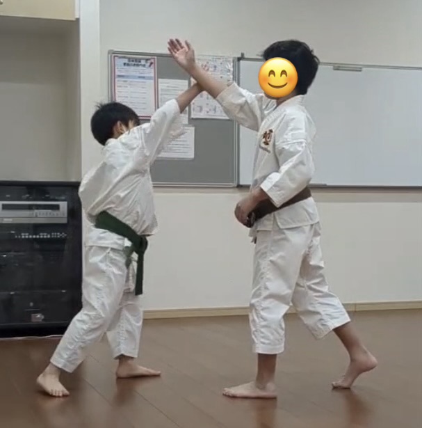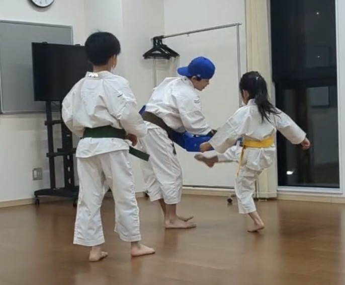 子供同士でのミット蹴りは、いつもよりパワーを感じます‼️(なぜかベイスターズキャップを被ったままの少年がいます)